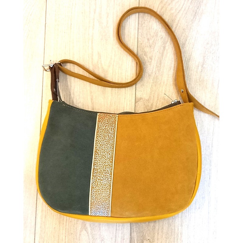 Un coté avec un cuir nubuck kaki, moutarde et une bande en cuir à motifs (impression numérique sur cuir)